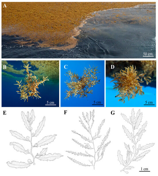 - Siuda, A.N.S.; Blanfuné, A.; Dibner, S.; Verlaque, M.; Boudouresque, C.-F.; Connan, S.; Goodwin, D.S.; Stiger-Pouvreau, V.; Viard, F.; Rousseau, F.; et al. Morphological and Molecular Characters Differentiate Common Morphotypes of Atlantic Holopelagic Sargassum. Phycology 2024, 4, 256–275. [Google Scholar] [CrossRef]