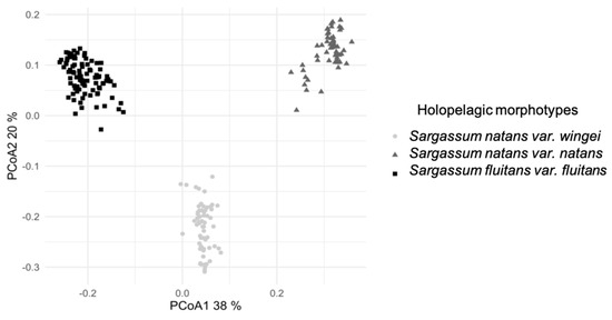 The PCoA showed a clear separation of the Sargassum specimens into three groups, corresponding to S. natans var. wingei, S. natans var. natans, and S. fluitans var. fluitans, according to the selected discriminating criteria. The selected morphological variables were thus suitable to differentiate the three morphotypes of holopelagic Sargassum into distinct groups using pertinent morphological criteria.