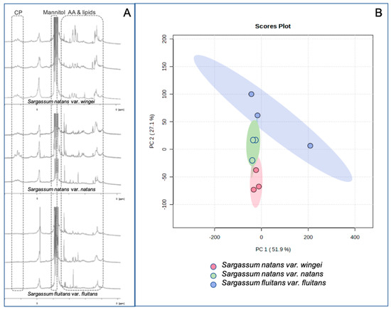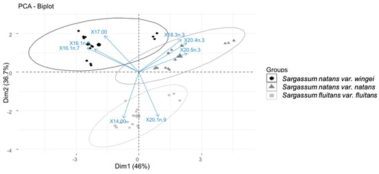 The PCA highlighted that the chemical fingerprinting of the three morphotypes is distinct, especially those from Sargassum natans var. wingei and S. fluitans var. fluitans, with S. natans var. natans positioned in an intermediate position (Figure 3B).