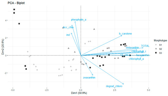 A PCA was then computed with all the pigment levels and ratios (Figure 4), showing strong variation among samples in pigment contents, mainly due to morphotype but also station differences.