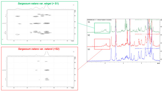 Structural elucidation of phlorotannins produced by Sargassum natans var. wingei (S1) and S. natans var. natans (S2). 1H Nuclear Magnetic Resonance (NMR) spectra of the three Sargassum morphotypes (S1, S2, and S3 as S. fluitans var. fluitans) (right side). Two-dimensional NMR spectra of S1 S. natans var. wingei (left side up) and S2 S. natans var. natans (left side down). On 2D NMR, chemical shifts of protons are on the X-axis, and chemical shifts of carbons are on the Y-axis. Proton signals between 5.5 and 6.5 ppm are characteristic of aromatic compounds, which encompass phenolic compounds.