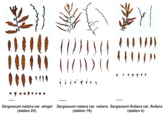 The morphological diversity of holopelagic Sargassum has already been described, as Winge and later Parr acknowledged four forms of S. natans (I, II, VIII, and IX) and two forms of S. fluitans (III, X) based on four morphological criteria [14,15]. A plate of selected specimens used in the morphological analysis illustrates particularities found in each holopelagic Sargassum morphotype (Figure 7).
