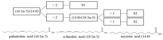 In regard to our study, the first observation was that a qualitative differentiation of the three morphotypes was not feasible on the basis of the presence or absence of a specific fatty acid, as each of the three morphotypes possessed all the fatty acids identified. However, the Simper statistical analysis allowed the selection of the eight fatty acids that contributed the most to the dissimilarity between the fatty acid profiles of the different morphotypes. Indeed, cis-7-hexadecenoic acid (16:1n-9), palmitoleic acid (16:1n-7), and margaric acid (17:0) in Sargassum natans var. wingei (0.43 ± 0.09% TFA, 10.00 ± 1.53% TFA, and 0.38 ± 0.05% TFA, respectively) were significantly higher than in S. natans var. natans (0.26 ± 0.05% TFA, 4.53 ± 0.46% TFA, and 0.14 ± 0.03% TFA, respectively) and S. fluitans var. fluitans (0.28 ± 0.07% TFA and 5.22 ± 0.54% TFA, 0.12 ± 0.04% TFA, respectively). Meanwhile, α-linoleic acid (18:3n-3), eicosatetraenoic acid (20:4n-3), and eicosapentaenoic acid (20:5n-3) in S. natans var. natans (3.69 ± 0.65% TFA, 0.53 ± 0.13% TFA, and 1.55 ± 0.97% TFA, respectively) were significantly higher than in S. natans var. wingei (2.21 ± 0.53% TFA, 0.32 ± 0.16% TFA, and 0.66 ± 0.53% T FA, respectively) and S. fluitans var. fluitans (1.82 ± 0.46% TFA, 0.26 ± 0.12% TFA, and 0.69 ± 0.63% TFA, respectively). Finally, myristic acid (14:0) and cis-11-eicosaenoic acid (20:1n-9) in S3 (4.17 ± 0.32% and 1.60 ± 0.21%, respectively) were significantly higher than in S. natans var. wingei (2.96 ± 0.20%TFA and 0.83 ± 0.14% TFA, respectively) and S. natans var. natans (2.63 ± 0.32% TFA and 1.05 ± 0.27% TFA, respectively). Thus, the proportions of these fatty acids were considered distinctive for the three morphotypes.