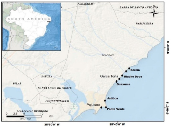 A research area of 408,736 m2 covering seven beaches was georeferenced with geographic coordinates from the first beach (Sereia) at 9°35′17″ S/35°38′49″ W to the last beach (Pajuçara) at 9°40′53″ S/35°42′19″ W. These seven beaches (Sereia, Riacho Doce, Garça Torta, Guaxuma, Jatiúca, Ponta Verde and Pajuçara) are located on the north shore of the city of Maceió, state of Alagoas, Brazil (Figure 1). The size of the sampling area was calculated using georeferenced collection points within “My GPS Coordinates”, in the NOAA satellite image application (U.S. Navy, NGA, GEBECO), based on Google Maps. The sample collection techniques used in this study were based on the methodology of the Brazilian Agricultural Research Company (EMBRAPA).