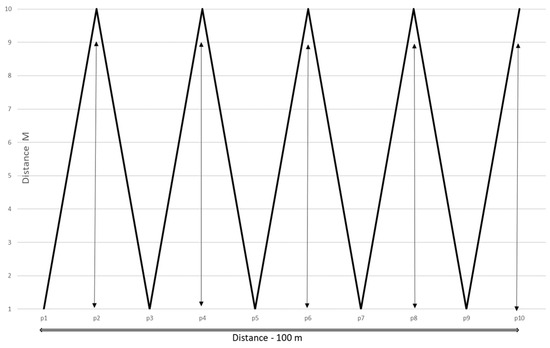 A zigzag model of diagonal lines [11,12] (Figure 2) was used, each line covering a distance of 10 m from one end to the other. The collection procedure required 100 m from the first to the last collection point, and thus there were 10 collection points per beach (Figure 2). A total of four collections were performed on each beach, and thus there was a total of 40 collection points per beach. Over a two-year period, samples were obtained from 280 collection points, i.e., 28 collections on seven beaches. These collections were performed in the months of March, April, September and October, which were taken to represent the two climatic seasons that exist in northeastern Brazil, i.e., “summer” and “winter”, respectively.