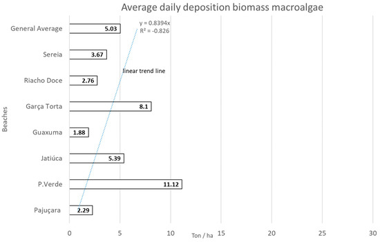 The average was at 9 m, defining a demarcation area of 135,000 m2. Regarding the seasonality of collections in the present study (Table 2), there was greater macroalgae deposition in the months of March and April (dry season), in both of the years surveyed (2015 and 2016), and lower deposition in September and October. These latter months form a regional transition period between the rainy winter and dry summer. The survey results showed that the average daily deposition was 5.03 t/ha (Figure 4). The potentially productive area of 135,000 m2 (13.5 ha) therefore yielded an estimated an average daily deposition of 67.90 t/ha, which gives an annual projection of 24,785 t/ha of dry weight. Previously, significant results were found in the state of Bahia, with beach-cast seaweed deposition (dry weight) of 5765 g/m2 in 2007 for Itapuã beach and 2269.7 g/m2 for Pituba beach in 2010 [10]. Another study [27] conducted on four potential beaches in northeastern and southeastern Brazil, in the states of Ceará, Pernambuco and Espírito Santo, found that the average biomass deposition ranged from 732.0 to 1041.2 g/m2, from four collections conducted in the months of February, March, May and June, in which taxonomic classification was also used with twelve species analyzed. In Brazil, “bloom” occurrence in three phyla comprising chlorophytes, rhodophytes and ochrophytes [10,28,29] has been found to increase deposition in coastal areas. The evaluation of macroalgal deposition areas at high and low tide, taking the phases of the moon to be a strong deposition agent, has shown that major deposition occurs at the full and new moons. This productivity factor of macroalgal biomass can become greater at the daily periods of greatest deposition at low tide with collection twice a day according to the tide table. In this, collection can reach amounts of approximately 10.06 t/ha daily, i.e., a projection of 49,570 t/ha/year in the respective area. This enormous production comes with the invariable condition that marine macroalgal biomass is the only form of biomass worldwide from which two collections per day can be performed. This is an exponential advantage in comparison with terrestrial biomass.