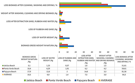 Macroalgae were collected manually along the shoreline and placed in 100-L plastic bags for weighing, using one for each collection point, to determine the gross weight per collection point, i.e., including any water, sand or residues. Afterwards, the material collected was washed with tap water in a stainless steel tank of dimensions 55 cm × 48 cm. A decantation method was used in which heavier solids such as sea sand were deposited at the bottom of the tank and rubbish was removed from the surface manually. Fine residual sand was removed by washing the macroalgae with running water delivered through a hose while laid out on 50/60 cm aluminum screens. After this process, the biomass was squeezed manually to extract as much water as possible and was then laid out in the open air to be sun-dried for three days. Assessments of biomass loss between the gross weight and net weight after removing the respective weights of water, sand and waste were made on three beaches (Jatiúca, Ponta Verde and Pajuçara) from a single collection by applying 1 m2 of polyethylene (pvc) material to the sample size on each beach. After determining the gross weight of the biomass, water was extracted through manual pressure, following the same methodology process as above and then reweighing.