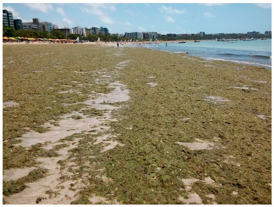 For Ponta Verde beach, with macroalgae deposition of 37.63 t/day and 13,737 t/year, even if an estimate of 50% average loss due to discontinuous areas is projected, the annual deposition may reach 6868 t/year. This percentage difference between continuous and discontinuous areas was assessed previously [53], in a study conducted in Odawa Bay, Japan, on the macroalgal seagrass carpet species Zostera marina Linnaeus, Zostera japonica Ascherson & Graebner and Halophila ovalis (R.Br.) Hook. Deposition varied by more than 100% across the research area. In an actual study, three random collections were carried out on Cruz das Almas and Jacarecica beaches, which do not have barrier reefs along their shorelines. A total absence of biomass deposition was observed on these beaches. This marginal coastal strip on the urban perimeter was displayed through different transects of biomass deposition. It represents relief transformations in the continental shelf region, in which marine macroalgae are found in different topographic formations. These irregular biomass accumulations interspersed along the coastal strip with sand may be associated with morphological accommodations of terrain and unequal arrangements of rocky beds in the barrier reef on these beaches. Prolonged coral formation favors benthic macroalgal development aggregated to the rocky substratum and provides ideal habitats for macroalgal growth (Figure 8).