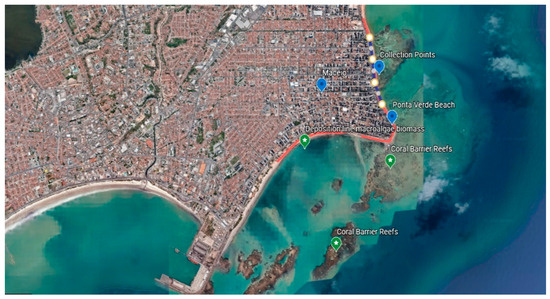 Deposition area macroalgae biomass in Ponta Verde beach with collection points near coral reefs. Source: Google Earth, (2022).