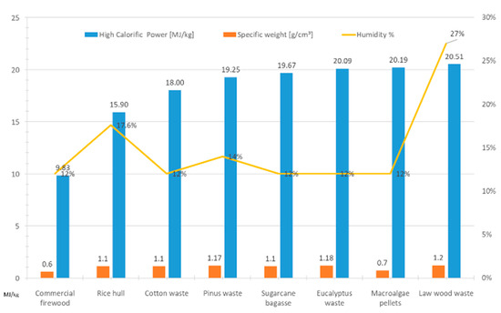 A comparison with the higher calorific value of terrestrial biomass [60,66] condensed into energetic composites such as in briquette form (Figure 10) showed that it ranged from 9.83 to 20.51 MJ/kg with an average of around 17.61 MJ/kg. This was 11.46% lower than the higher calorific value of macroalgae aggregated into condensed pellets, as determined from five samples evaluated in the present study, which was 20.19 MJ/kg (Figure 10). The lower calorific values of the pellets and briquettes were equivalent, without significant difference when analyzed for the same biomasses, given that the compression and moisture suppression processes for these two cylindrical formats are similar. The average HCV for terrestrial pellets (19.96 MJ/kg), as evaluated in two previous studies [63,67], was 1.15% lower than that of macroalgae pellets (20.19 MJ/kg) (Table 5).