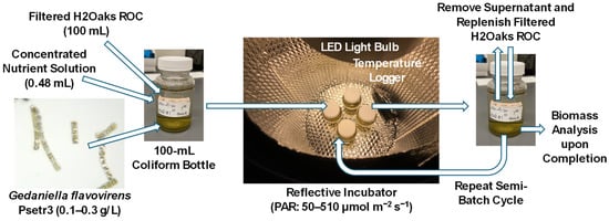 A series of semi-batch photobiological treatment experiments were conducted to examine the effects of light and temperature in a controlled environment, following the methods outlined in our previous study [21]. Clear 100 mL polystyrene coliform bottles (Grainger, Lake Forest, IL, USA) were used as reaction vessels (Figure 1). Filtered H2Oaks ROC was added to the vessels, along with a seed culture of G. flavovirens Psetr3. The initial amount of diatom biomass to be added was determined based on our previous studies [21,22], ensuring consistent silica uptake rates during the semi-batch photobiological treatment experiments. The ROC was supplemented with a concentrated nutrient solution (Fritz F/2 Algal Food Part B, Fritz Aquatics, Mesquite, TX, USA), resulting in final concentrations of nitrate-N and orthophosphate of approximately 15 and 5 mg/L, respectively. Aliquots of seed culture were collected in 1.5 mL microcentrifuge tubes to determine initial dry biomass weight.