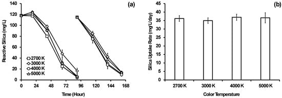 Silica uptake by G. flavovirens Psetr3 in H2Oaks ROC with LED light bulbs of various light temperatures: (a) uptake curves and (b) uptake rates. (Temperature: 23 ± 1 °C; PAR: 200 ± 5 μmol m−2 s−1; 10 W LED: 2700, 3000, 4000, and 5000 K; initial biomass concentration: 0.106 g/L).