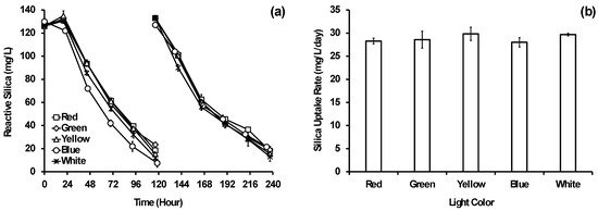 Silica uptake by G. flavovirens Psetr3 in H2Oaks ROC under incubation of five different light colors: (a) uptake curves and (b) uptake rates. [Temperature: 21 ± 1 °C; PAR: 40–50 m−2 s−1; 8 W LED: red, green, yellow, blue, and white (10 W, 2700 K); initial biomass concentration: 0.335 g/L].