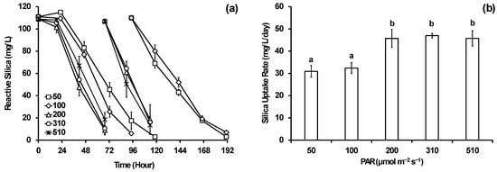 Impact of light intensity on the silica uptake by G. flavovirens Psetr3 in H2Oaks ROC: (a) uptake curves as a function of PAR in μmol m−2 s−1 and (b) uptake rates. [Temperature: 23 ± 1 °C; PAR: 50, 100, 200, 310, and 510 μmol m−2 s−1; 10 W LED: 2700 K; initial biomass concentration: 0.164 g/L. Groups labeled with the same letter (e.g., ‘a’) are not significantly different, while groups with different letters (e.g., ‘a’ and ‘b’) are statistically different (padj < 0.05) based on Tukey HSD].