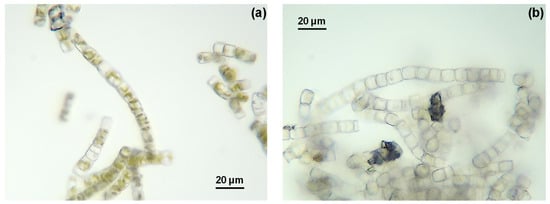 In our previous study, silica uptake was shown to slow and even slightly reverse during periods when water temperatures reached around 40 °C [20]. Temperature is a critical factor influencing the growth of algae such as diatoms, as it strongly affects cellular metabolism, including nutrient and carbon dioxide uptake and overall growth rates [24]. While this study did not directly investigate the relationship between temperature and growth rate, the results demonstrate that temperature also impacts silica uptake by diatoms. Figure 6 presents photomicrographs of diatom cells incubated at 30 and 40 °C. The cells incubated at 30 °C (Figure 6a) retained their green pigments, indicating healthy growth, while those incubated at 40 °C (Figure 6b) appeared bleached, with no green pigments remaining. This color change from green to white during the experiment confirms that diatom cells died at the higher incubation temperature.