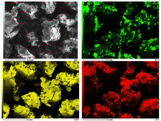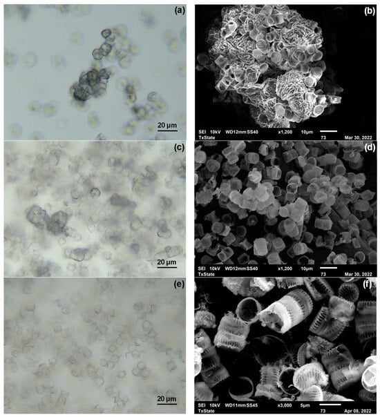 The biomass obtained during the photobiological treatment experiments of the H2Oaks ROC was characterized to quantify frustules (silica, SiO2), calcium carbonate (calcite, CaCO3), and organic components for potential beneficial uses. Calcium precipitation during photobiological treatment, which is presumably resulting from a pH increase (to approximately 9) induced by photosynthesis, has been recognized in previous studies [18]. Figure 7a (light photomicrograph) and Figure 7b (SEM) display dried and reconstituted G. flavovirens Psetr3 biomass grown in H2Oaks ROC before undergoing bleach–citric acid treatment. The frustules appear green, indicating the presence of organic materials (e.g., chloroplasts). Additionally, transparent, irregularly shaped crystals were observed, which acid treatment identified as calcite. The SEM-EDS analysis of dried biomass further confirmed the presence of calcium in these precipitates (Figure 8). In the SEM-EDS images, silicon (Si, green) and calcium (Ca, yellow) did not overlap, while oxygen (O, red) was associated with both silicon and calcium, clearly indicating the presence of silica and calcite in the dried biomass. Following bleach treatment, the frustules lost their green color but retained their shape, while the calcite crystals remained visible (Figure 7c). SEM also confirmed that the frustules’ structure remained intact after bleach treatment (Figure 7d). Finally, citric acid treatment effectively removed the calcite crystals, leaving the biomass primarily composed of silica-based frustules (Figure 7e,f).