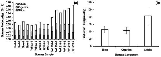 Subsequently, the relative abundances of silica frustules, organics, and calcite in the diatom biomass were determined using the digestion and citric acid treatment results. Biomass composition varied across experiments due to the treatment efficiency and length. For instance, the average total biomass produced during the colored bulb experiment (Figure 3) was 0.0835 ± 0.0008 g after two cycles, compared to 0.1552 ± 0.0022 mg/L in the various PAR experiment (Figure 4) conducted at PAR levels of 200, 310, and 510 μmol m−2 s−1 after three cycles. As shown in Figure 9a, silica, organics, and calcite accounted for 26 ± 5%, 31 ± 7%, and 43 ± 7% of the biomass, respectively. The silica content obtained through digestion and citric acid treatment closely aligned with estimates from wet chemistry mass balance analysis. Using the most efficient biomass production data (from the various PAR experiment), the production rates of silica, organics, and calcite were estimated at 46 ± 8, 43 ± 9, and 83 ± 22 g/m3/day, respectively (Figure 9b).
