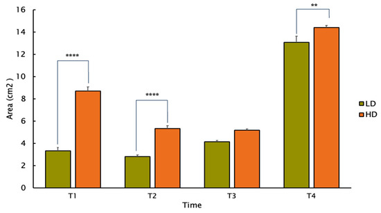 Coverage area of Laminaria hyperborea recruits (mean ± SE) varied for the interaction between different seeding densities (high (HD) and low (LD) density) and time (T1: 5 weeks post-seeding, T2: 6 weeks post-seeding, T3: 7 weeks post-seeding, and T4: 8 weeks post-seeding). Significant differences are indicated by * (**: p ≤ 0.01; ****: p ≤ 0.0001).