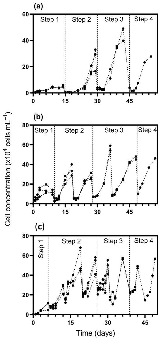 By step 3, all strategies showed increased cell densities: 44.37 × 104 cells mL⁻1 for the 10% inoculum, 56.62 × 104 for 25%, and 48.75 × 104 for 50%. The onset of this phase was more synchronized across treatments, occurring on days 30, 28, and 26, respectively. In the final phase (step 4), peak densities were reached at 27.75 × 104, 46.25 × 104, and 56.75 × 104 cells mL⁻1 for the 10%, 25%, and 50% inoculum strategies. Notably, the 10% treatment entered this step on day 45, maintaining a short acclimation span. The 25% culture reached it on day 49, while the 50% strategy showed faster development, beginning exponential growth as early as day 39.