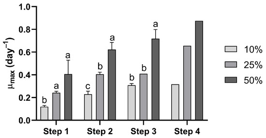 Regarding the maximum specific growth rate (µmax), step 1 showed that the strategy with 10% inoculum differed from the other treatments, presenting a significantly (F = 12.09, p = 0.008) lower µmax compared to the strategies with 25% and 50%, indicating a slower and less efficient start of cultivation. In step 2, significant differences (F = 20.96, p = 0.002) were observed between all inoculum percentages. In step 3, the treatments with 10% and 25% inoculum were statistically similar (F = 61.62, p = 0.0001), differing only from the 50% treatment. Regardless of the cultivation step, the use of a 50% inoculum resulted in higher µmax values compared to the other treatments. Except for step 3, the 10% inoculum strategy led to lower specific growth rates than the 25% treatment (Figure 2).