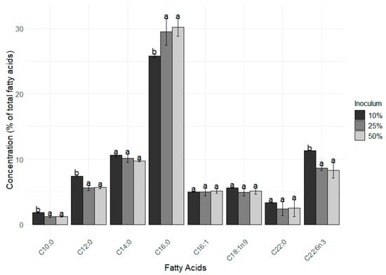 In addition to growth performance, the fatty acid composition was also influenced by different inoculation strategies. The main (% above of 2% of the total FAMEs) FAMEs found in the D. glynnii biomass were C10:0, C12:0, C14:0, C16:0, C16:1, C18:1 n9, C22:0, and C22:6 n3 (Figure 3). The lower inoculum percentage (i.e., 10% strategy) resulted in higher percentages of C10:0, C12:0, and C22:6 n3 in comparison to the 25% and 50% inoculum strategies. On the other hand, values of C16:0 were significantly higher (F = 14.71 p = 0.006) in the 25% and 50% treatments when compared to the 10% one.