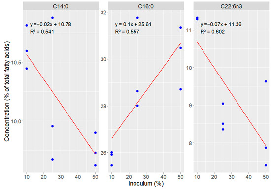 A direct relationship was observed between the increase in inoculum concentration and the increase in the proportion of palmitic acid (C16:0), which ranged from 25.8% with 10% inoculum to 30.17% with 50%. In contrast, polyunsaturated fatty acids showed the opposite trend, with higher levels in the 10% inoculum condition and progressive reduction in concentrations of 25% and 50%, evidencing an inversely proportional effect, clearly observed in the distribution of fatty acids shown in Figure 4.