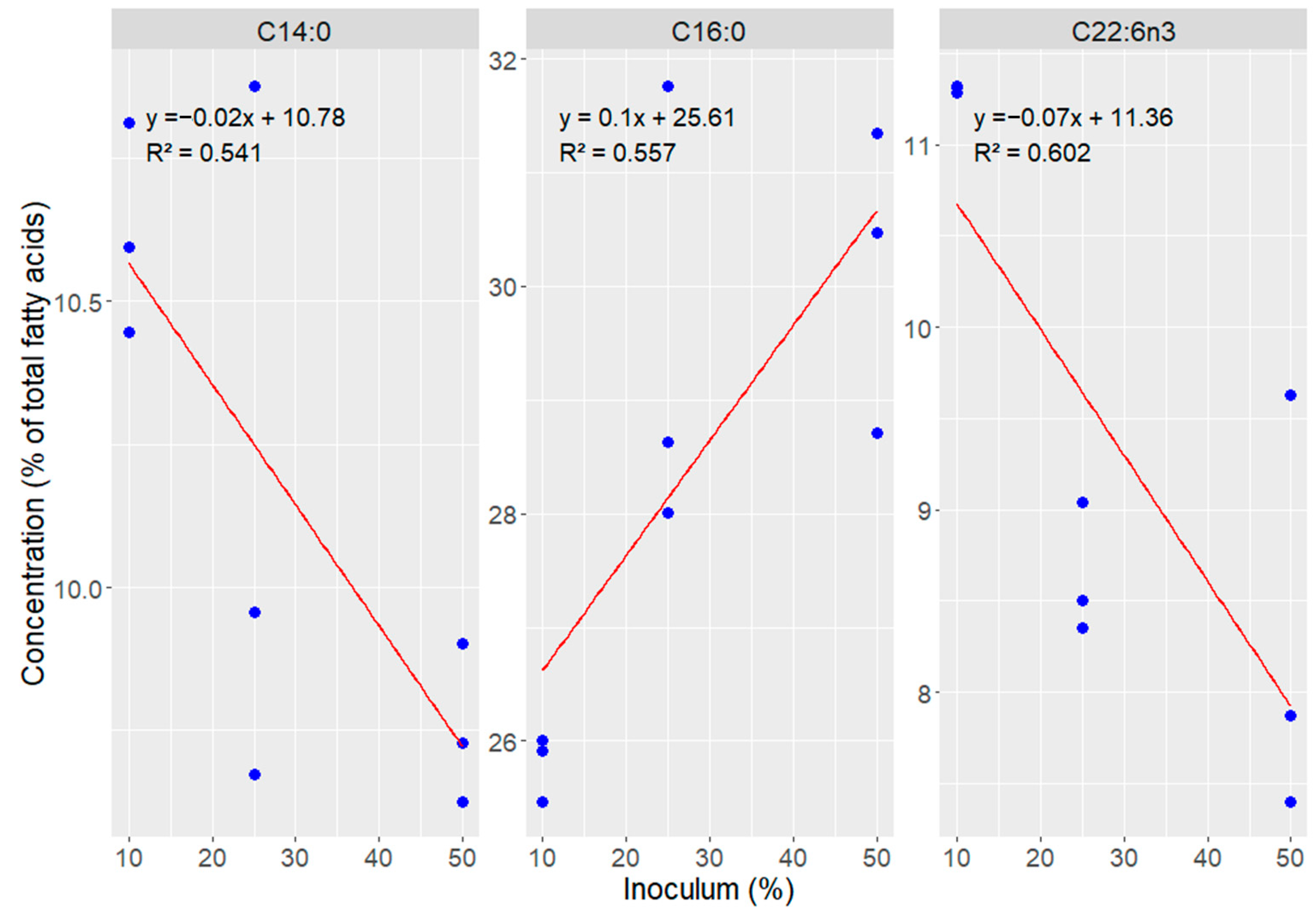 Correlation between inoculum percentage and fatty acids concentration in Durusdinium glynnii biomass grown using different strategies of scaling-up.
