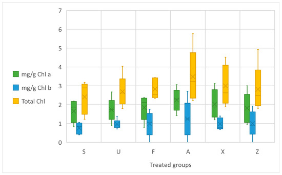 Chlorophyll leaf content in mg/g Chl a, Chl b, and Total Chl. Notes: Sargassum muticum (S); Ulva ohnoi (U); Furcellaria lumbricalis (F); Ascophyllum nodosum (A); MC Extra, commercial product (X); negative control (Z).