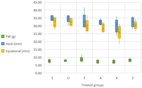 Physical parameters of the fruit, presented in terms of grams of fresh weight (FW), axial (mm) and equatorial (mm) measurements. Notes: Sargassum muticum (S); Ulva ohnoi (U); Furcellaria lumbricalis (F); Ascophyllum nodosum (A); MC Extra, commercial product (X); negative control (Z).