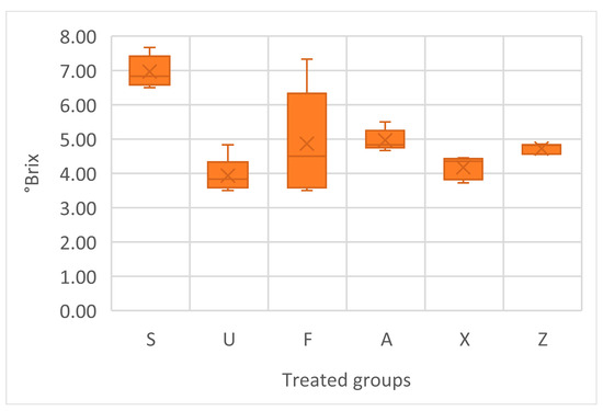 The soluble solids content, measured in °Brix, varied across the treatments (Figure 6). The one-way ANOVA indicates that there are statistically significant differences among the groups in regard to °Brix values (p < 0.005). Sargassum muticum (S) showed the highest average value of 6.57, with a relatively low standard deviation of 0.46, indicating consistent sugar accumulation. The Ulva ohnoi group (U) had the lowest average °Brix at 3.93, with a moderate spread in the data. Furcellaria lumbricalis (F) had a mean of 4.87, but also the highest variability, suggesting the occurrence of heterogeneous responses within this group. Treatments with Ascophyllum nodosum (both A and Z) had similar means, 4.97 and 4.73, respectively. The control group showed an average of 4.17, with moderate consistency.
