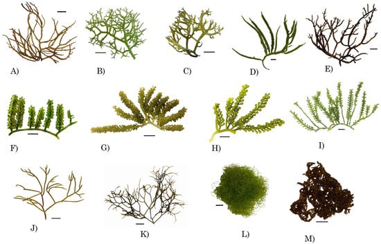 - Reddy, G.; Rao, K.; Harsha, M.; Venkateswarlu, V. Nutritional content of marine macroalgae (seaweeds) from Kanyakumari coastal district, Tamil Nadu, India. Int. J. Fish. Aquat. Stud. 2023, 11, 123–126. [Google Scholar] [CrossRef]
