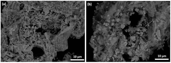 The surface morphology of BC and MBC was examined through SEM analysis. The unmodified biochar displayed its typical structural traits, including an irregular yet smooth surface, as illustrated in Figure 1a, consistent with findings reported in earlier studies [37,38], in which the authors described the structure of the biochar as having a relatively low surface area and limited interaction with adsorbates. In contrast, impregnating the biochar with FeSO4 and FeCl3 significantly altered its surface. As seen in Figure 1b, the surface of the MBC became rougher and more heterogeneous, indicating the formation of clusters due to the iron deposition compounds onto the biochar. This occurrence was explained as a result of magnetic forces combined with the effects of surface tension, as described by [39], who reported that iron-modified biochar exhibits increased surface heterogeneity, which could enhance the material’s ability to interact with contaminants.