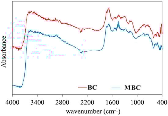 As illustrated in Figure 2, the functional groups available on the BC and MBC surfaces were determined using FTIR analysis. The spectral peaks for BC and MBC showed similarities in terms of wavenumbers. Peaks near 1782 cm−1 and 1627 cm−1 were attributed to C=O and C–O groups, representing the existence of carboxyl and aromatic compounds [39].