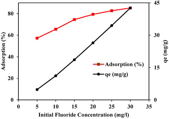 The study investigated the impact of varying initial fluoride concentrations on the adsorption process, observing significant changes in adsorption capacity. Under optimal conditions (including stirring time, pH, and adsorbent dosage), the adsorption capacity was enhanced substantially as the fluoride content rose from 5 to 30 mg/L. Specifically, the capacity surged from 2.4 to 21.3 mg/g, as illustrated in Figure 3. Fluoride adsorption efficiency was achieved at 85.24% at the highest tested fluoride concentration of 30 mg/L.