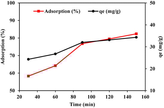 Under optimal conditions (fluoride concentration: 25 mg/L, pH: 4, adsorbent dosage: 60 mg), the influence of contact time on fluoride adsorption by iron-modified biochar was studied. The fluoride adsorption capacity increased from 12.1 mg/g to 17.2 mg/g as contact time extended from 30 to 150 min. The highest fluoride removal efficiency of 82.4% was obtained at 150 min. Initially, the adsorption efficiency rose rapidly from 58.3% to 76.8% within the first 90 min and then increased gradually up to 150 min (Figure 4). This rapid initial adsorption was due to the abundance of available adsorption sites and the high fluoride concentration, which created a strong driving force for fluoride removal. As the process continued, the rate of fluoride uptake slowed significantly. This deceleration was attributed to the decreased accessibility of adsorption sites and the lower fluoride concentration in the solution, which weakened the concentration gradient driving the adsorption process [43].
