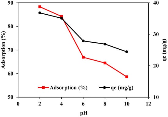 Influence of pH on the adsorption efficiency of the macroalgae-derived adsorbent modified with iron (contact time: 150 min, fluoride concentration: 25 mg/L, adsorbent dosage: 60 mg, and temperature: 35 °C).