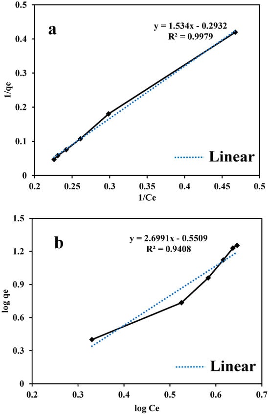 Linear graph of (a) the Langmuir and (b) Freundlich isotherm models.