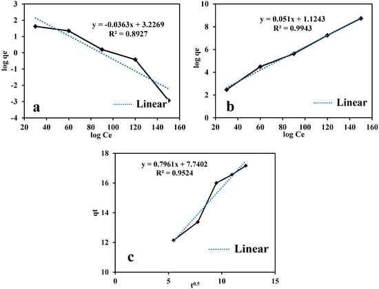 The mathematical equations of the Langmuir and Freundlich models can be defined as (Equations (3) and (4)):