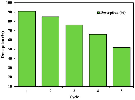 Regeneration plays a crucial role in creating cost-effective adsorbents for fluoride adsorption. In this experiment, 0.1 M NaOH was employed as the regenerating means over five cycles. The desorption efficiency gradually declined from 91% during the first cycle to 53% by the fifth cycle, as shown in Figure 9 These results suggest that 0.1 M NaOH is a viable option for regenerating spent biochar, making it a practical choice for industrial and commercial applications.