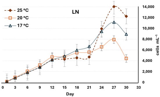 Further analysis of the growth curves revealed distinct patterns across the tested temperatures. The culture maintained at 17 °C exhibited a relatively short exponential phase, ultimately reaching a maximum density of 9283 cells mL−1. In contrast, the culture at 20 °C displayed the most anomalous behavior; its growth during the exponential phase was the slowest among the three temperatures, and it achieved the lowest maximum cell concentration of 7303 cells mL−1. Under low nutrient (LN) conditions, the culture maintained at 25 °C consistently showed the highest cell density, as noted previously.