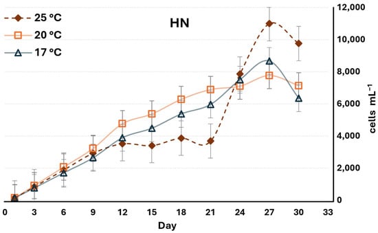 Growth of L. polyedra cultivated at 17, 20, and 25 °C under a high nutrient concentration regime (HN:NO3 at 0.15 gL−1 and PO4 at 0.01 gL−1).