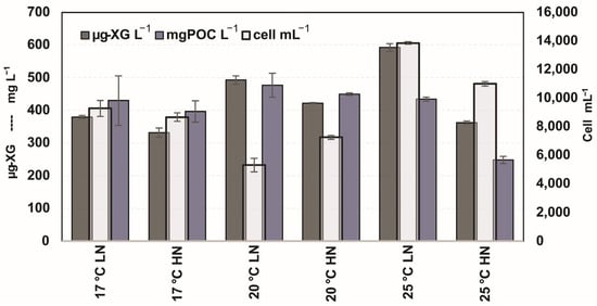The lowest TEP values per cell were recorded at 17 °C, with 0.04 μg-XG cell−1 in the LN treatment and 0.01 μg-XG cell−1 in the HN treatment. In contrast, the highest values occurred at 20 °C: 0.06 μg-XG cell−1 (LN) and 0.05 μg-XG cell−1 (HN). At 25 °C, intermediate values of 0.05 μg-XG cell−1 (LN) and 0.03 μg-XG cell−1 (HN) were observed (Table 4, Figure 6).