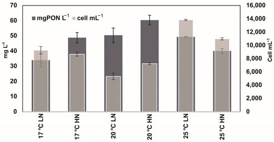 PON concentration (mg L−1) and cell concentration (cell mL−1) quantified in L. polyedra culture, three culture temperatures at 17 °C, 20 °C, and 25 °C with LN, and HN.