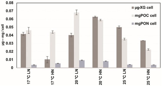 At 17 °C, POC concentrations per cell were relatively uniform, with values of 0.046 mg cell−1 (LN) and 0.044 mg cell−1 (HN). The highest per-cell POC concentrations were recorded at 20 °C, reaching 0.068 mg cell−1 with LN and 0.059 mg cell−1 with HN. In contrast, POC concentrations decreased at 25 °C, with values of 0.035 mg cell−1 (LN) and 0.022 mg cell−1 (HN) (Table 4, Figure 6).