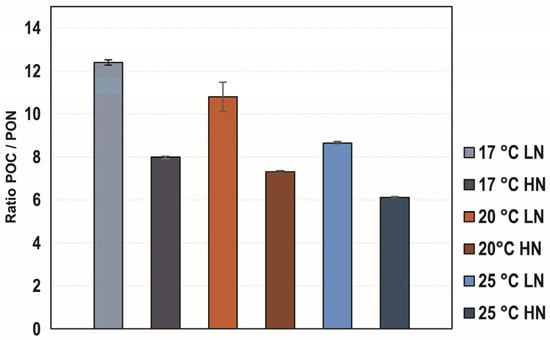 The POC:PON ratio varied with temperature and nutrient availability. Under low nutrient (LN) conditions, the highest ratios were observed, reaching values of 12.4 at 17 °C, 10.8 at 20 °C, and 8.6 at 25 °C. In contrast, under high nutrient (HN) conditions, the ratios were consistently lower: 7.9 at 17 °C, 7.3 at 20 °C, and 6.1 at 25 °C (Figure 7).
