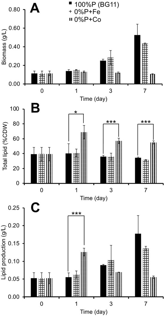 Cultivation of Chlorella sp. under P deprivation in BG11 with added metals (Fe and Co). (A) Biomass (g/L), (B) total lipid (%DCW), (C) lipid production (g/L). All the data are expressed as mean ± standard deviation from cultures that were run in triplicate (* p < 0.1; *** p < 0.001).