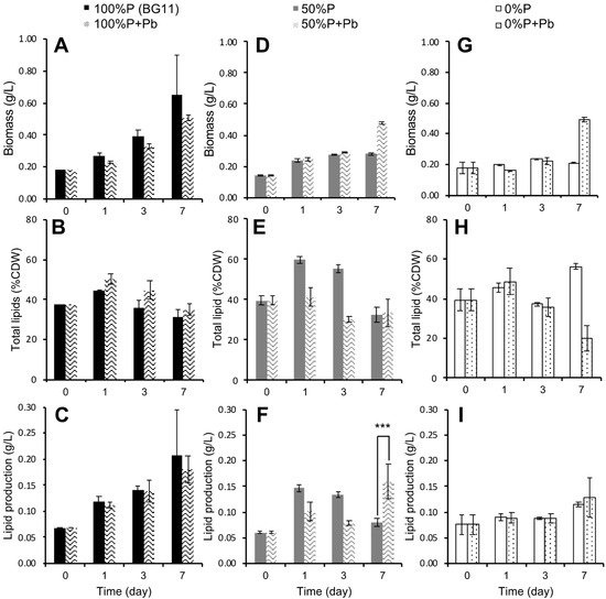 Cultivation of Chlorella sp. under P limitation in BG11 with added Pb: 100% P (A–C), 50% P (D–F), and 0% P (G–I). All the data are expressed as mean ± standard deviation from cultures that were run in triplicate (*** p < 0.001).