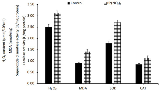 During oxidative stress, polyunsaturated fatty acids are oxidized and generate MDA, which is considered an oxidative stress marker. Cell walls are damaged, and the cells try to adapt by means of lipid peroxidation [61]. In the present study, the MDA level was increased after Pb treatment (Figure 4), which confirms that the cells are able to defend against the oxidative stress.