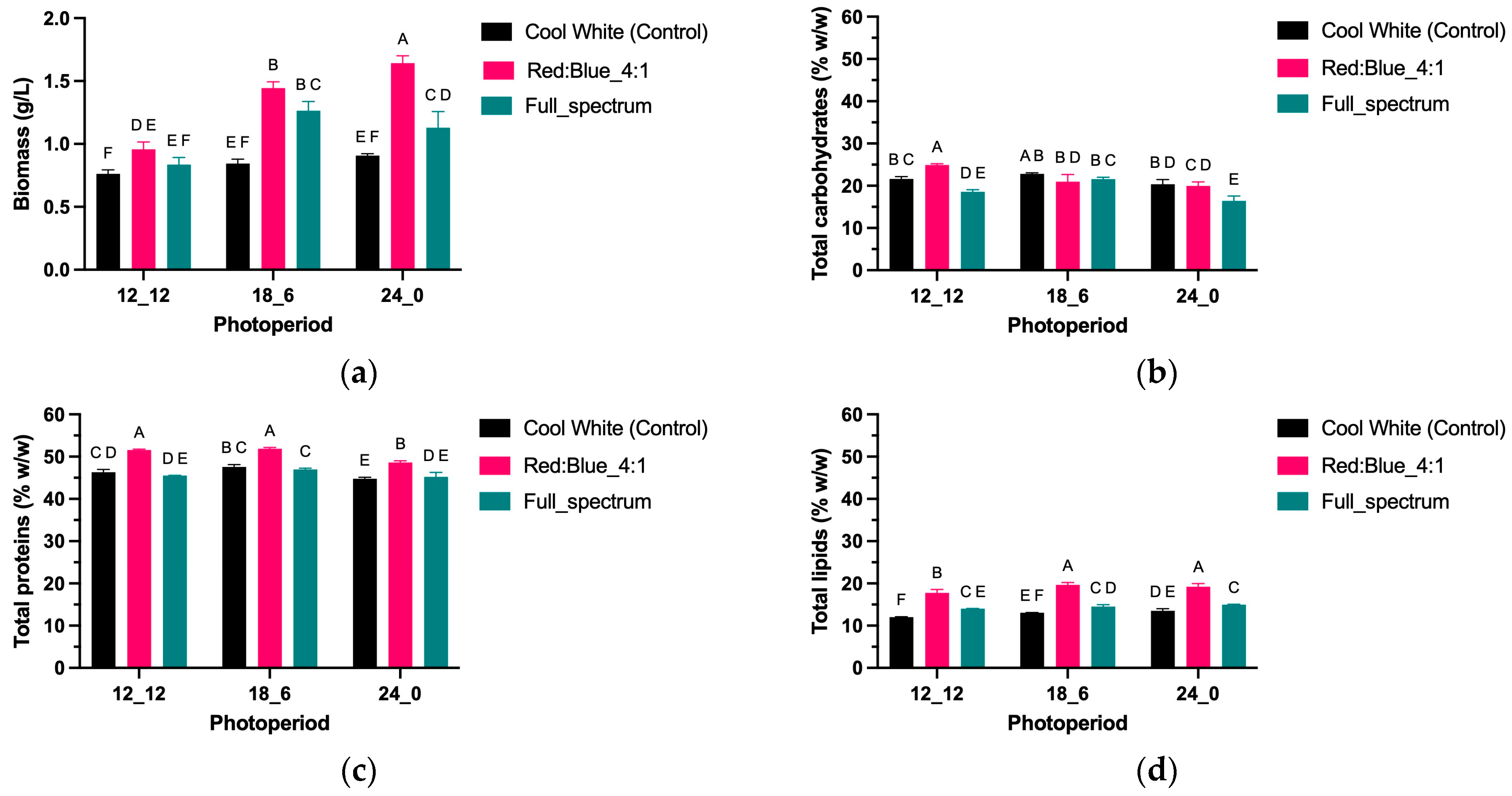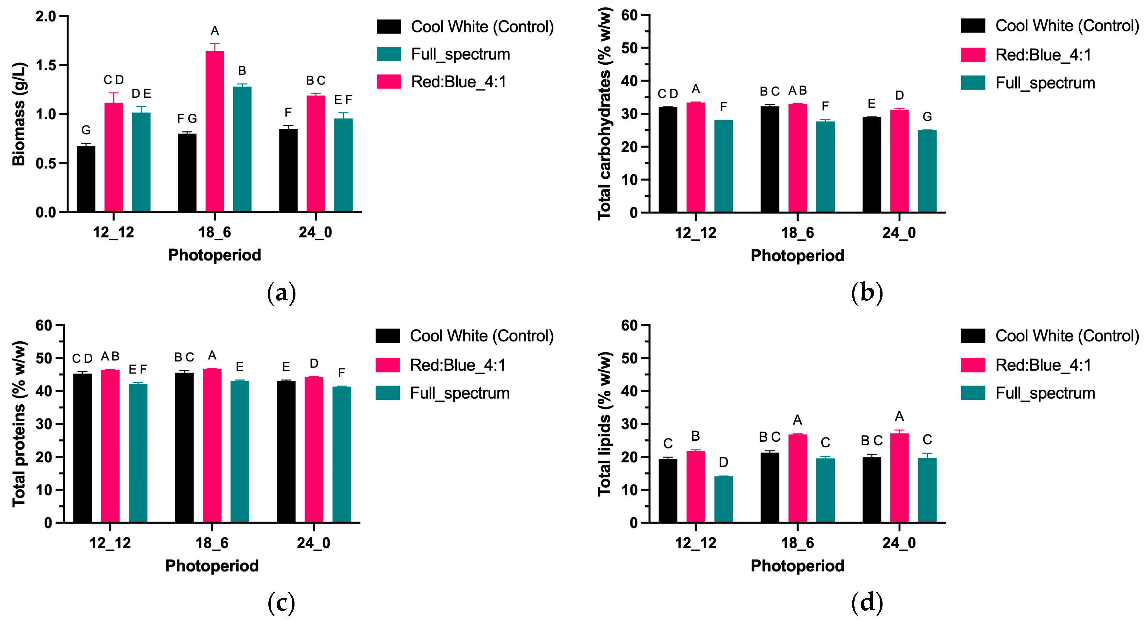 Figure 2d), with cool white 24:0 also in A; intermediate levels were observed under cool white 12:12 and full spectrum 24:0 (groups B and C); low responses under cool white 18:6 and full spectrum 18:6 (groups C and D); and the lowest under full spectrum 12:12 (group F), with red–blue 12:12 in CE. The preference of both strains for red–blue mixtures with medium-to-prolonged photoperiods for triacylglycerol accumulation coincides with reports that red light sustains the supply of reducing power and acyl-CoA precursors, while blue light co-activates lipogenic genes [