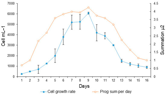 Growth curve of the dinoflagellate Gymnodinium catenatum in the culture medium f/2 enriched with selenium. Shaded circles indicate cell growth (cell mL−1). Open circles indicate daily progressive cell growth as a cumulative growth rate. The bars indicated the standard deviations.